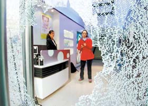 昨天上午记者赶到现场时看到,大场面眼镜店其中一扇玻璃门中间被砸出一个大洞,碎玻璃洒落一地,没有洒落的玻璃也已经完全碎裂。该店值班员陈先生告诉记者,昨天凌晨2点左右,听到楼下“哐啷”一声,下楼发现玻璃门被砸碎了,但是并没有丢失任何物品,大场面方面怀疑是同行所为。据了解,目前警方已经介入调查。