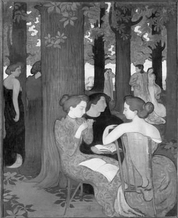 德尼是纳比社团的最杰出的艺术家之一,并提出了纳比派绘画的“双重调整”理论。即客观的调整,把美学和装饰的观念放在第一位,强调色彩和构图的技术原则;主观的调整时强调作者本人的知觉。他的作品色彩强烈,线条扭曲,有装饰美。对装饰美术和工艺美术的发展有着重要作用。