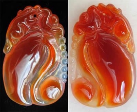 俏色作品要分色清楚,用色忌混。玛瑙上的颜色分布是千变万化的,色与色之间有对比关系,用色要注意对比强烈,绝妙的俏色作品,不仅仅分清颜色,对比强烈,更重要的是在依料赋形的基础上,依色赋形,使作品形色相依,与自然形态绝妙吻合才富有情趣,才是绝妙作品。