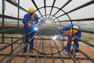 下图为安徽送变电公司施工技术人员在焊接1000千伏特高压黄河大跨越灌注桩基础钢筋笼。