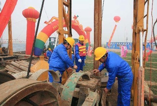 下图为安徽送变电公司施工技术人员在进行1000千伏特高压黄河大跨越工程灌注桩基础钻孔。