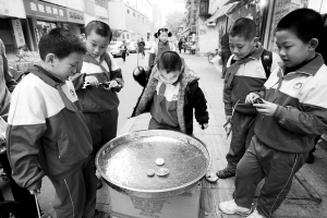 上个双休日,记者走访了杭城的一些小学,发现在一些离学校不远处的文具店或杂货店的门口,都摆着一个“平底铁锅”一样大的圆盘,一帮小男孩围着这个大圆盘拉开架式,原来在进行“陀螺大战”。