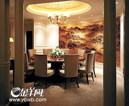 会客厅半扇墙旁边,是一间可容纳10人同时进餐的餐厅兼会议室,圆形的餐桌和高背座椅旁边的一面墙是一幅中国山水金箔画,据说是画师直接在金箔上绘制的。在餐厅的对面是一间十几平方米、具有家庭气氛的欧式厨房。厨房内有电冰箱、微波炉、各种调料品和整齐的一排厨柜和吊柜。客人可以在这里制作各种自己喜爱的家庭美食。厨房设有单独的出口,服务人员或者厨师尽可以由此穿梭进出,而不会骚扰客人。