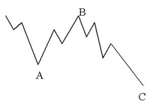 (一) 锯齿型调整浪,是简单的三浪下跌模式,标示为A—B—C。其子浪的顺序是5—3—5,而且浪B的高点应明显比浪A的起点低。有时锯齿型调整浪会一连发生二次,或至多三次,尤其是在第一个锯齿型调整浪没有达到正常目标的时候。在这些情况下,每个锯齿型调整浪会被一个插入的“3浪”分开,产生所谓的双锯齿型调整浪或三锯齿型调整浪。在推动浪里,第2浪常常走出锯齿型调整浪,而第4浪很少如此。