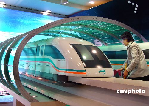 图为在上海浦东高速行驶的磁悬浮列车。2007年5月27日,上海闵行区政府办公室证实,目前沪杭磁悬浮项目已经暂停。据悉,百姓比较关心磁悬浮辐射问题,政府相关部门正在研究,这是磁悬浮暂停的原因之一。国家发改委交通运输司长王庆云表示,沪杭磁悬浮目前进入的只是工程性研究阶段,而之前国务院审批通过的仅是立项,此后还将进入工程审批和初步设计两个阶段。中新社发 海牛 摄
