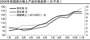 据记者调查,5月中旬至6月中旬,短短一个月时间,市场上金属镨、钕的现货报价最高已达30万左右/吨,这一价格较2006年初累计上涨高达120%-150%。实际上,自2005年下半年起,稀土资源扭转了一度“贱卖”境地,价格开始逐步回升。