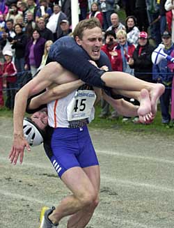 今年是第12届“背老婆”比赛,共有来自12个国家的44对夫妇报名参赛。在往届比赛中,爱沙尼亚选手一向优势明显,今年他们再次包揽了比赛的前两名,马迪斯·乌索格与妻子因加·克劳松以61.7秒的成绩最先跑到终点,他们的奖品是一台等离子电视机,以及与冠军妻子体重相等的49公斤啤酒。