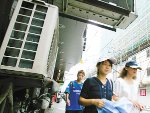 “经过那些小店,就像过火焰山一样!”近日,市民罗先生经过宜山路轻轨站时,忽然被一阵热气包围,热气是从一家快餐店挂得很低的空调外机吹出来的。近日记者采访发现,不少路边店面的空调外机悬挂不符合规范,热风猛吹,令行人叫苦不迭。