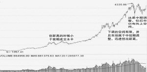 实际上,因为此时个股往往已经出现了较大的跌幅,这种分析对于个股的实际操作意义不是太大,但它对于大盘的把握较有意义,对于判断今后的市场有非常重要的指导性。如果一个指数下跌的幅度超过20%,就应该视为较大的调整了,正常的情况就是从最高点算,可在下跌10%到15%之间寻找到一个调整的中轴。此时,成交水平应该是迅速的萎缩,日成交下跌到最近一年的成交之下,但股指没有创新低,只有在盘整过程中成交大幅萎缩,在这种情况下,后市往往是有望再度向上的。