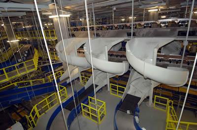 T3行李系统最大的特点就是安全性更高了。以前旅客托运的行李都是通过X光机扫描,T3行李系统采取的是五级安检,行李首先要通过X光检测,如果没有发现异常情况,就可以进入行李系统;如果发现异常,就进入人工检查,有60名安检人员对照X光的成像进行分析。如果还不能判断出结果,就将进入GTS进行检查(计算机化X光断层扫描),GTS主要通过扫描切片,对危险爆炸物进行检查。GTS进行检测后仍确定不了,就将进入到第四级的爆炸物痕迹探测。这项技术非常先进,如果有人在行李内放置了爆炸物,这种技术可以通过检查行李表面的遗留痕迹探测出行李内是否有爆炸物。如果以上四级都确定不了,最后通过开包检查,确定行李是否安全。此外,如果行李系统在任何一级检查后被确认为是安全的,都会自动回到行李系统。