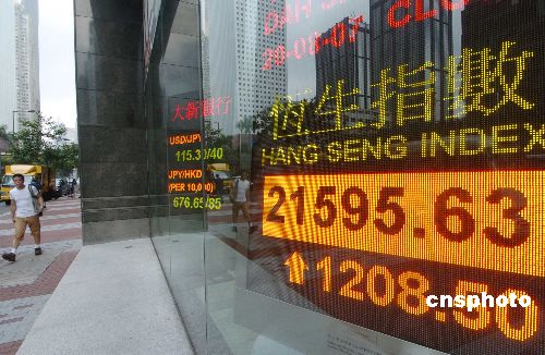 8月20日,香港股市跟随美股和区内股市上升高开六百余点,午市內地宣布以试点形式准許天津滨海新区市众直接投资港股,刺激港股升幅加剧扩大,以接近全日最高位收市。香港恒生指数收市报21595.63点,上升1208.50点,全日成交1053.29亿元。中新社发 邓庆乐 摄