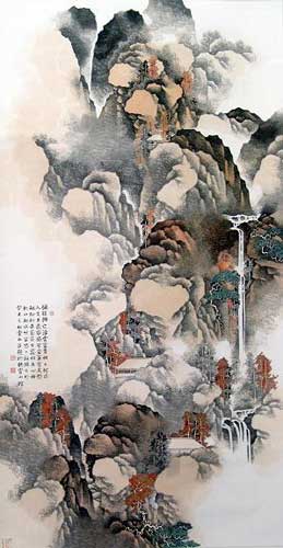 在这些山水画里,雄浑的气势,无尽的流泉,与静谧的群山交融在一起。值得注意的是李氏精彩的用笔。画面由李氏湿笔点染,水、墨、色在宣纸上的层层洇渗,产生出厚重的质感,美奂美仑,妙不可言。站在李氏的画前,使人感到如置身于水气氤氲、生机盎然的大自然之中。山的轮廓与起伏跌宕的坡面,在李氏出神入化的渲、染、点、皴之下,有机地贯联在一起,淡淡地化入云雾之中,丝毫不留斧凿之痕。画面上的丛林或簇叶,掩映的村舍与屋顶,与山水相映成趣。李氏擅长使用虚笔,即留白,在宣纸上某处不着一笔,但以实衬虚,画面上的虚处在观者眼中便成了实实在在的飘逸的云雾、山岚和冬天枝桠与岩石上的积雪。如果仔细观察,你会发现虚实相互渗透、衬托,缺一不可。这也反映出艺术家浓厚的道家意识。这种阴阳互动、相辅相成的关系,使得画面象自然界一样,充满生机和活力。