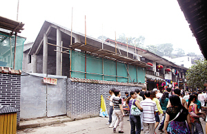 市商务集团磁器口项目负责人蔡先生表示,拆掉的是危房,木头已朽掉。除了临街门面是老房子,即原来的“聚生茂”作坊外,里面原是商务集团下属酿造厂房,历史并不长。拆危重建后将进行外包装,使它看起像老房子。蔡表示,如果用木材,不仅成本高,而且不好买。