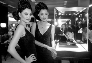 前晚,北京国际顶级私人物品展在国贸展厅正式开幕。“北京国际顶级私人物品展”源于“TOP MARQUES摩纳哥顶级私人物品展”。展品涵盖豪华汽车、游艇、珠宝、手表、家居、房产等6大类,参展商多为国际大牌,而且展会只对受邀嘉宾开放。作为中国大陆地区惟一受邀参展的翡翠珠宝品牌———七彩云南为此精心准备了这次展览,展品中普通的翡翠价值都在100万至800万元,除了价值近7000万元的镇店之宝外,还有获得过“天工奖”金奖的“荷塘鱼童”、“时尚翠美人”系列顶级产品,总价值近3亿元。本报记者 胡雪柏 摄影报道