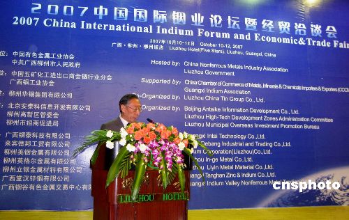 中新社柳州十月十一日电(记者 蒙鸣明)二OO七中国国际铟业论坛今天在广西柳州举行,来自中国及美国、日本、澳大利亚的有色金属行业专家和企业家共同就中国铟工业发展现状和对策、世界铟市场前景等众多课题进行研讨,为中国铟业的发展提供思考和方向。