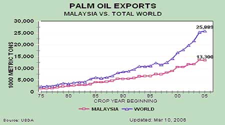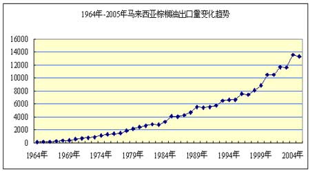 马来西亚是世界上最大的棕榈油生产和出口国,其棕榈油总产的90%被用来出口,马来西亚出口的棕榈油只有很少量属于未经提炼的毛棕榈油。1985年以前,马来西亚几乎控制着整个棕榈油的出口市场。1986年,马来西亚毛棕榈油的生产量为454万吨,占同年世界棕榈油产量的60%,出口的棕榈油占世界棕榈油出口量的68%。1996年,马来西亚棕榈油的产量为886万吨,占世界总产量的53%,出口量为732.5万吨,占世界总出口量的64%。随着近几年印度尼西亚棕榈油出口份额的不断增加,马来西亚棕榈油的出口量下降到了占全球一半份额左右。2005年全球棕榈油总出口量达到了2630万吨,其中马来西亚棕榈油出口达到1345万吨,占49%,印度尼西亚棕榈油出口为1030万吨,占39%。