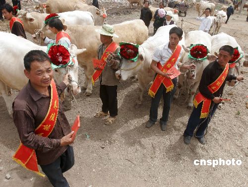 5月14日,一场特殊的选美大赛在河南洛阳嵩县田湖镇一河滩举行,该镇各村200多头肉牛参加比赛,这些肉牛是从全镇上万头肉牛海选出来的。据悉,该比赛是当地农民文化节一个主要内容。中新社发 张晓理 摄