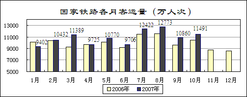 铁路客运量快速增长。当月全国铁路客运量1.21亿人次,同比增长9.5%。国家铁路客运量1.15亿人次,增长9.6%;其中直通旅客增长7.1%。1-10月,全国铁路客运量11.57亿人次,增长7.5%。国家铁路客运量10.98亿人次,增长7.1%;其中,直通旅客4.11亿人次,增长9.2%。