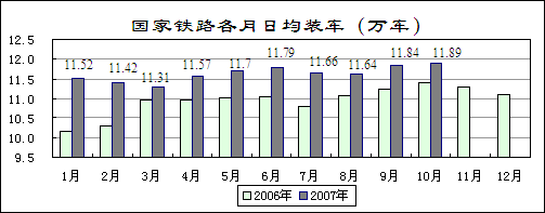 1-10月,全国铁路日均装车138919车,同比增长7.9%;完成货运量25.89亿吨,增长9.1%。国家铁路日均装车116359车,增长6.7%;完成货运量21.72亿吨,增长7.3%,其中煤炭运量10.16亿吨,增长9.7%。
