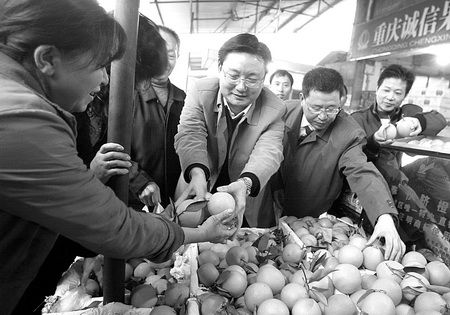 昨日,菜园坝水果批发市场,奉节县领导为市民挑选脐橙 记者 欧阳祖兵 摄