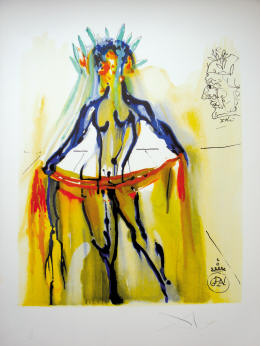带着这样颠倒黑白的逻辑,你或许才能理解达利的“梦”。展览中的雕塑,最著名的是达利的成名作“太空象”:这是一头四腿如丝的苗条大象,背负着沉重的方尖石塔,仿佛在艰难迈步。把现实对象的混淆,这是达利的成名绝技,《超现实主义钢琴》同样如此,在那个特殊的钢琴里,达利第一次给予了钢琴生命:钢琴的腿是舞蹈女子的腿,在钢琴的上方,窈窕舞姿的女子正伴随着钢琴美丽的音乐起舞,似乎钢琴也可以舞蹈了。达利游历在现实和超现实之间,将静止的、非生命的物质变成理想的、有生命力的艺术品。