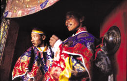 次日一早,天蒙蒙亮,隔壁的喇嘛们开始忙碌起来。等一切准备停当,两个年轻喇嘛就扛着巨大的法号来到寺门外。第穆寺建在山坡上,寺门正对河谷中的村庄,远望可看到雅鲁藏布江宽阔的水面。小喇嘛吹响低沉的法号,这是宣布法会要开始了。不久,就有村里人三三两两地沿山坡走上来。男人们顶着毛茸茸的新皮帽,女人们穿着有丝缎花绣的工布袍,男男女女的手里都提着酒壶,看来他们要借此醉上一场了!