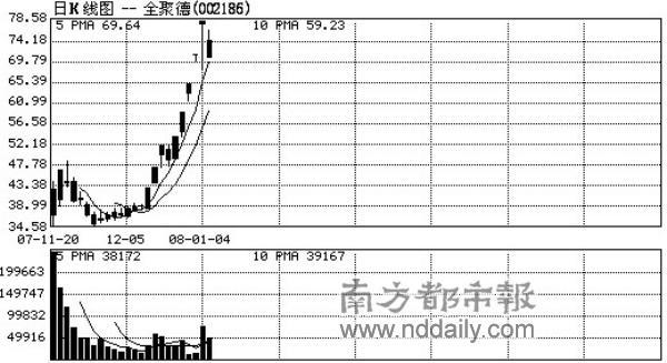 一位有多年投资经验的个人投资者对记者表示,虽然无法认定“庄家的总指挥”就是全聚德股价飙涨的背后推手,但纵观全聚德近期来的表现不难发现,私募在其中兴风作浪的痕迹还是较为明显。“应该是那些私募做的,现在很多民营企业的资金也是非常充裕。”他对记者表示。