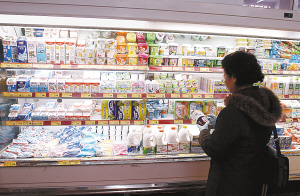 图为一位消费者在北京的一家超市选购牛奶制品,品种之丰富,让她挑花了眼。现在好了,食品营养标签马上要统一规范了,我们消费者又多了一个贴心“向导”。