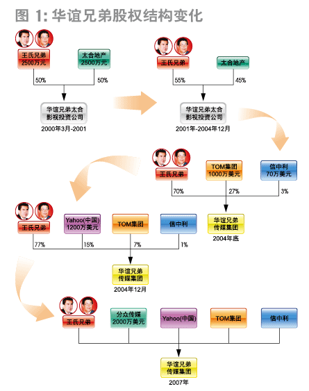 华谊兄弟传媒集团的前身华谊兄弟广告有限公司,由王中军、王中磊兄弟于1994年创办。2000年3月,王中军和太合集团各出资2500万元,将其重组为华谊兄弟太合影视投资有限公司,王中军兄弟持有50%的股权。2001年王氏兄弟又从太合控股回购了5%的股份,拥有了公司的绝对话语权。