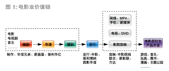 影业的产业链分为制片、发行、放映三大环节(图1),除华谊兄弟所在的制片领域外,院线是另一个由寡头垄断的环节。