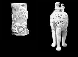 香薰为装饰环境之用品,也用以书房,故也被列为文房珍宝。图中“龙纹三足白玉香薰”,为明代富贵人家所用器,高20.5厘米,整件器物采用阳雕、圆雕、镂空雕三种技法精雕细刻而成,龙纹与如意纹饰是该香薰的主体图案,只见龙纹条条傲立器物之上,如意纹饰布满器身。由于年代久远,使得该香薰玉质出现诸多沁色,但仍可从细微处辨察到原有新疆和田白玉的滋润感。