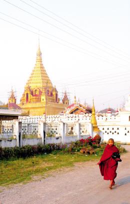 缅甸5000多万人口,笃信佛教的人占85%以上,寺庙、佛塔随处可见,小小的娘水镇起码有三座寺院。在缅甸乡间,寺庙不只是供人朝拜的地方,几乎是一个当地人的公共活动中心。由于男子一生必须要出家一次,大多缅甸男孩会在9~12岁之间第一次披上袈裟,这时,寺庙还担当着教育的职能。在娘水,我信步走入一个寺庙参观,碰到一位年轻僧人拿着课本给小和尚们上课。小和尚们摇头晃脑念着课本,看到窗外有游客在注视他们,有些不专心的孩子故意念得很响,还露出顽皮的笑。