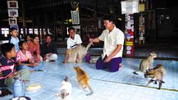 在回程路上,船夫说带我们去一个有趣的地方——大名鼎鼎的跳猫寺(Nga Phe Kyaung)。其实茵莱湖畔不乏佛教圣地,比如金光闪闪的帕瑞佛塔(Phaung Daw Paya),里面供奉着五尊12世纪铸造的古佛像,由于在佛像上贴金箔的人太多,使得佛像已经分不清五官和四肢,完全变成了5个形象模糊的金球。可跳猫寺在游客中的名声却远胜于帕瑞佛塔,只因为那里有一群会跳圈圈的小猫。据说跳猫寺有位老僧人在参悟佛法时,看到身边跃起的一个小猫,突发奇想开始训练在寺里游逛20多只猫咪跳圈圈。训练成功后,消息传出,游客纷纷前来参观,小猫也名扬海外。当然这和马戏团训练狮子跳火圈的原理是一样的,当小猫跳过圈,肯定能赏到美味吃食。我到跳猫寺时,看到一群孩子正围坐在一起,旁有大约有六七只漫不经心的花猫。只见一人,拿起一个塑料圈举到30厘米的样子,圈前的那只正踱步的猫忽然跃起,穿过了圈圈,不一会,每只猫都轮流跳了一遍。看似懒惰的猫咪每次起落,都激起了孩子们的欢笑。