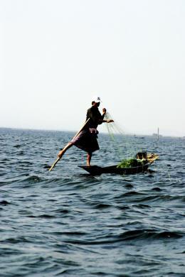 快船行驶在浩瀚的茵莱湖上,凉爽的风吹来,甚是惬意,途中我们经常遇到勤劳的茵达渔民。他们通常是一人一舟,而此地仅有的单脚划船绝技是渔民们的看家本事,堪称茵莱湖一景。当地人认为,用脚划船速度快且更有耐力,腾出双手又能同时撒网、持叉,一人作业即可完成整个捕鱼过程。从茵达人定居在此,就已经有这个传统,至今仍延续着,在我们外人看来,自然是啧啧称奇。我们的船夫也很贴心,每次遇到渔民,就把船速减慢,一来不惊扰渔民的工作,二来也可以让我们更从容地拍照。