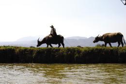 早上从蒲甘出发时,我已经身有不适,昨天晚上的排档小吃把我的肠胃防御系统全面击溃,一路上,除了偶尔和同伴说笑两三句,我大部分时间都是蜷缩在车里,窗外的风景就如默片上演——热带密林、沟壑、大山、溪水、田野一一从我眼前掠过。临近黄昏时,汽车开始沿着河道行驶,进入了水乡,空气也变得湿润起来,河道边正好有一群耕牛排队行走,有一个孩子悠然自得地骑在领头的牛背上。牧童唱晚,真是久违的情景,假如牧童手上还有一支短笛,就可为贺绿汀的钢琴曲《牧童短笛》配图了。