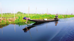 湖上浮岛,又是茵达人的一大智慧创造,一般浮岛分天然浮岛和人工浮岛,对茵达人来说,它们都是漂浮在水面上的土地。我们在湖上经常能遇到当地人在收集漂浮在湖面上的水草,他们把水草和浮萍以及藤蔓植物收集起来,上面再覆盖湖泥,就成了新的浮岛,然后开出一条条的田垄,用竹篱固定住,就可以在上面种植。这也是茵莱湖特有的生产方式,不过,为了保护茵莱湖的水质,他们不使用任何化学肥料,只使用天然肥料,由于肥力有限,浮岛上不能耕种粮食,只能种植一些番茄、辣椒等蔬菜以及鲜花。在一块浮岛前,为了证明下面没有承托物,船夫让我用竹篙戳一下浮岛试试,刚才看上去固定的“土地”确实随着湖面的涟漪而升降。茵莱湖三面环山,常年风平浪静,这些浮岛也不担心湖水暴涨和干枯,所以茵达人一年四季都可享用新鲜的有机蔬菜。当然,因为茵莱湖是缅甸最盛名的景区之一,茵达人也在旅游开发中获益。他们在村落里开设了一些银器、铁器、丝绸、木制手工艺品等商店,都是前店后厂式,游客可以参观传统的手工制作过程。假如游客只是参观,不买商品也不会遭受白眼,主人照样笑脸送客,这也体现了茵达人豁达的生活态度。