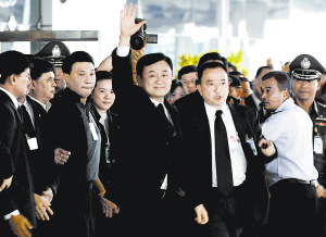 泰国前总理他信·西那瓦28日上午乘坐泰国航空公司班机从中国香港回到曼谷,从而结束了他自2006年9月泰国发生军事政变后一直滞留国外的生活。从机场离开后,他前往法院投案,并花重金获得保释,最高法院决定3月12日就他信涉嫌在任职期间滥用职权,使其夫人朴乍曼以低价成功中标曼谷市区一处国有地产案举行第一次听证会。新华社发