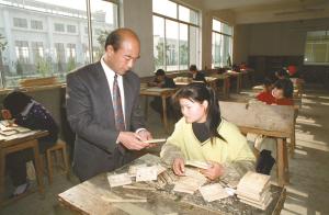 1995年1月,张果喜在车间检查产品质量。江西果喜实业集团董事长张果喜原是一位木匠,1973年9月他攥着1400元钱,办起内地最早的一家民营企业———余江县工艺雕刻厂。国外媒体称他为“中国最年轻的亿元富翁”。刘继伍 摄