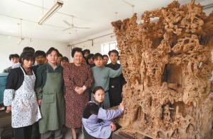 1998年7月,陈丽华(左三)与紫檀雕刻厂的职工在一起。1976年,陈丽华从香港的亲戚处引进外资,在北京海淀区建成了私营企业紫檀家具厂,成为中国第一批利用外资的私营企业家之一。王呈选 摄