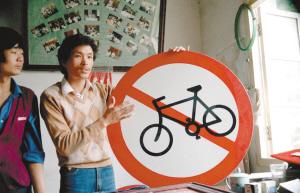 1987年12月,陈加枢展示厂子生产出的交通标志———铝合金定向反光膜交通牌。1984年,温州市苍南县金乡镇转业军人陈加枢等人合股兴办了徽章厂。该镇是当时温州市十大商品生产基地之一。欧启明 摄