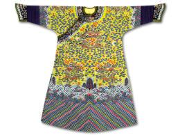 此外,瑞格华兹所提供的另一件清道光贵族妇女缂丝织锦无袖朝挂(估价12万美元到15万美元)也同样非常罕见。这件朝挂的图案设计不同于一般的皇室服装,但与清朝最高两个等级的格格服饰非常相似,这样的服饰如今鲜有存世。同样特殊的还有一件栗色薄丝龙褂(估价10万美元到15万美元)。它是用金线和彩线以十字绣法制成。在清朝服饰制度中,黄色有五种变体,栗色就是其中之一。由此推测,这件龙褂的主人可能是皇室宗族中的一员。