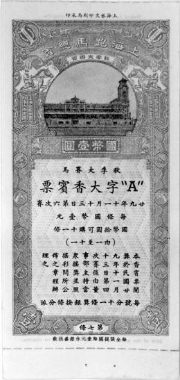 大香宾票。这是为赛马而发行的彩票。当时的上海,赛马十分时兴。每一个节日必发行一次独赢彩票,由跑马厅从中抽取1/4作为经费。最后一天,还要举行一次大香宾赛。为此而发行的彩票,即为“大香宾票”。此“A”字大香宾票系上海跑马总会于民国29年(公元1940年)11月30日为秋季大赛马而发行的,厚白纸质,呈西洋风格的蓝底白色网样花纹为主题图案,中间框内为淡黄曲线底纹,上有“秋季大赛马‘A’字大香宾票”等字样,并印有每条售价国币l元及注解文字,上端则是上海外滩风景的一角,两旁各印有“上海跑马总会秋季大香宾票”,上方为骑着赛马奔驰图案。背面也以错色底的花纹框之,上端为赛马场景。下方是英文,有编号,同时还标有“每全张提国币l元作为慈善捐款”。