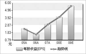 预计贵州茅台08、09年EPS分别为4.6、6.2元,给予公司09年45倍PE的合理估值,并给予“推荐”的评级。