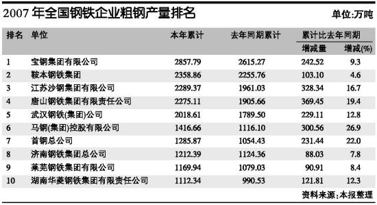 附表 2007年全国钢铁企业粗钢产量排名
