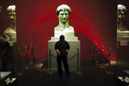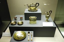在展厅的一隅,一套朱红色盒子装的银镶金旅行用具套装闪闪发光,这乃是手工匠人马丁·纪尧姆·比昂内为拿破仑特制的。这套包括了洗面盆、牙刷、剪刀等等92件物品的套装使用了象牙、金银,其中有78件都是专门用作梳洗的工具。皇帝在杜伊勒里宫使用的餐盘也同样出自比昂内之手,耗资4万个金法郎。最早当拿破仑在法国大革命当中被称作一个“公民”的时候,人们大概没有想到他后来会成为最接近历史上全盛时期罗马帝国皇帝的人。甚至当他在流放的小岛上逝世之后,很多法国人仍然对他抱有强烈的热情,展览上也可以看到在他逝世48小时之内,先用石膏倒模,然后用青铜铸造的他的面具。
