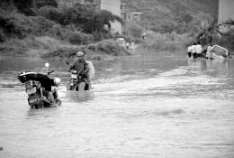 图为6月15日,人们骑摩托行驶在广西梧州市长洲区长洲镇的一条被水淹没的公路上 新华社图强降雨持续袭击华南,广东多个地市形势告急。