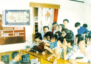 1986年9月,飞乐音响柜台交易第一天的景象。左上角为飞乐音响原始股票样。