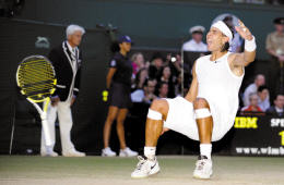 要么费德勒延续在草地赛场的势头,实现温网六连冠;要么纳达尔忘记红土赛场与草地赛场的区别,法网加冕之后首度温网折桂——总有一个人要创造历史。但世界第一费德勒开局即被纳达尔打了一个0比2未免有点出人意料,更出人意料的则是费德勒随后发动的“帝国反击战”,他竟然连扳两局将双方拉回至同一起跑线。温网五连冠得主找回了应有的尊严。但这个夜晚,小费德勒5岁的纳达尔表现出了更加顽强的斗志、更加良好的状态和更加急切的渴望,在先后错过了4个赛点之后,22岁的纳达尔因为费德勒的正手回球下网而兴奋得扔掉手中的球拍,倒地仰天,喜极而泣。这是纳达尔在与费德勒18次对决中的第12场胜利。1980年,瑞典球王比约·博格在法网与温网的连续作战中先后折桂。28年后,纳达尔接过了老球王的衣钵。