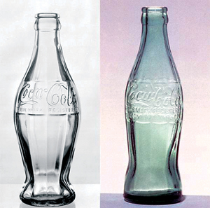 其实可口可乐经典玻璃瓶(contour bottle)是由 Earl R. Dean 于1915年设计的。当时可口可乐想寻找一种可以和其他饮料瓶区分开来的瓶子,并且无论白天还是晚上,甚至是打破了也能识别出,为此他们举办了比赛,Root Glass 公司参与其中,Earl R. Dean 是Root公司的瓶子设计师以及模具管理员。他们开始想以这种饮料的两种成分———可可叶和可乐豆作为出发点,但不知道它们长什么样,然后在图书馆看到《大英百科全书》中一幅可可豆豆荚的图片,并以此设计出了这个经典的瓶子。但当时他们的模具生产机械马上要进入维修,所以 Earl R. Dean 在24小时内画出了草图并作出了模具,而且在机器关闭前试制出了一些。1916年被选中并当年进入市场,1920年成为可口可乐公司的标准瓶子。图1左侧也是Root公司的最初原型,但是没有投入生产,因为在传送带上不稳定,右侧就是经典的玻璃瓶。