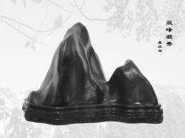 秦明兴一眼就看中了其中一块形状奇特的贵州盘江石。这块奇石一面为天然平底,另一面则有子母双峰,双峰对峙,一高一低,峰、谷变化自然柔和。所谓水冲石,也就是在河水中,经长期冲刷而成的石头,多圆润有型,能够形成如此特殊的形状,实属难得。而如今这块石头不仅石皮黝黑、了无杂色,石质也非常细密、温润如玉、手感极好。秦明兴对它爱不释手,当场就以3万元人民币,把石农的一整批奇石都买了下来。如今这块石头已被他奉为镇馆之宝,还将它的倩影作为他“秦石轩艺术品公司”的注册商标图案。